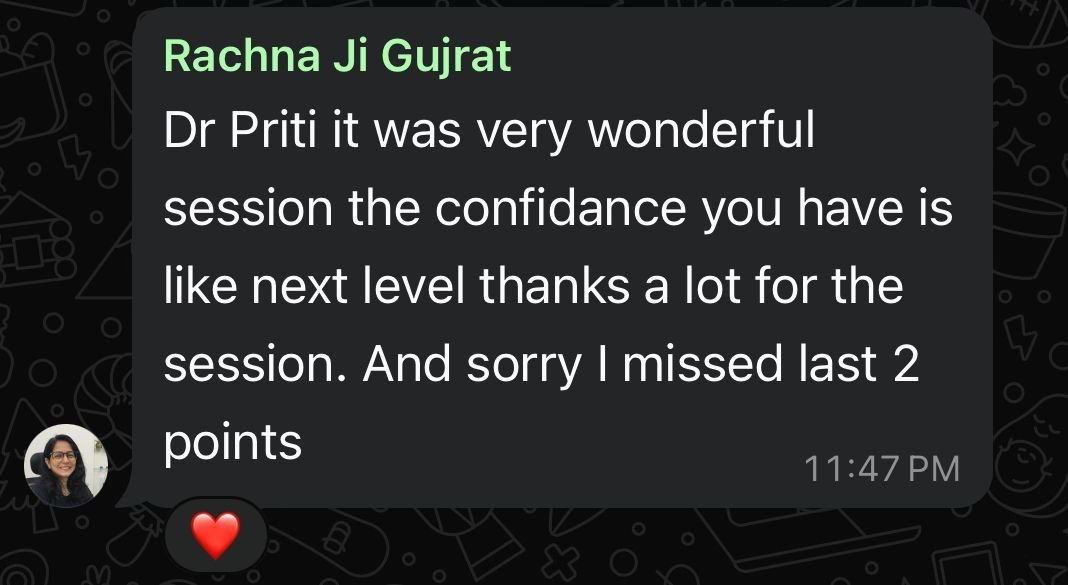 Book via Dr.Preeti's website. Reschedule at least 24 hours in advance if needed.