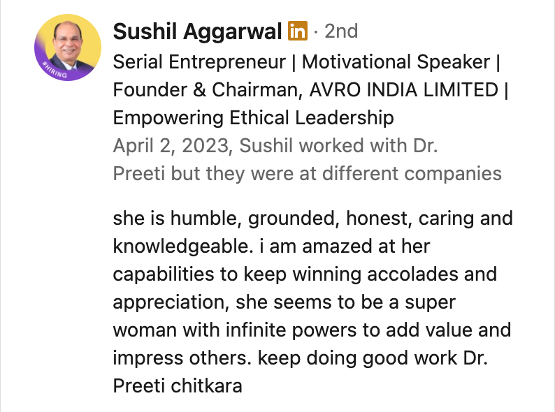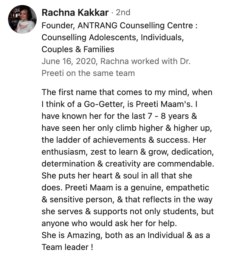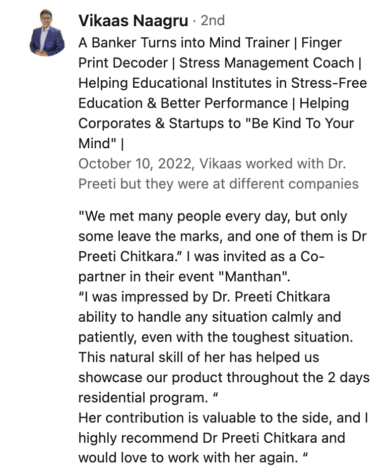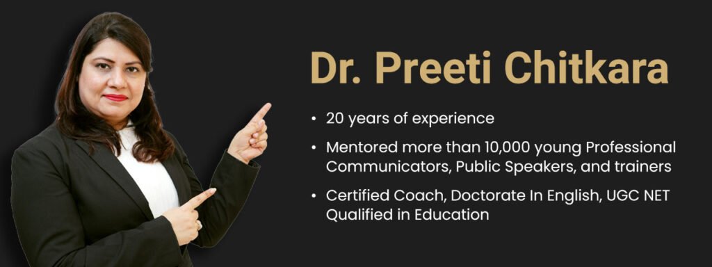 Dr. Preeti Chitkara is a Mind Power Trainer and Personal Development & Life Coach as well as an Educationist with 20+ years of experience. She is an Educational Brand Strategist and Communication Transformation Catalyst with over 20 years of experience. She has mentored over 10,000 young professionals and is committed to empowering youth and the higher education sector to meet global standards. As the Professor & Head of Public Relations and International Relations at one of the premier Engineering Institutions in Delhi-NCR, Dr. Chitkara oversees communications, branding, event management, and international relations. With a PhD in English, M.Ed., UGC NET qualified in Education, and a Diploma in Training and Development, she is a Certified Coach who excels in mentoring, training & teaching communication skills, public speaking and academic writing and contributes immensely in Personal Development of her students. A published author and versatile artist, Dr. Chitkara has received numerous accolades, including the Global Teacher’s Award and the International Women’s Achiever’s Award. Her anthology, *Blues under the Silver Hues*, and books titles Brand Management & Business Management offer inspiration to students, teachers, professionals and parents.